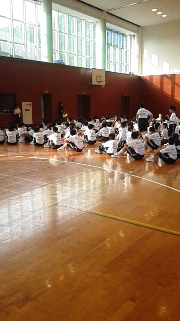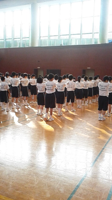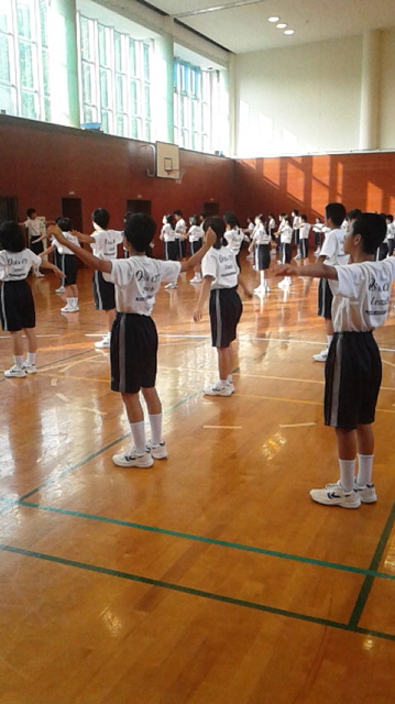 夜の間に雨もあがり、晴れ渡った二日目の始まりです。体育館に差し込む明るい日差しの中、朝の集いでラジオ体操をしています。
