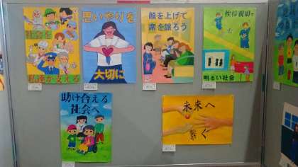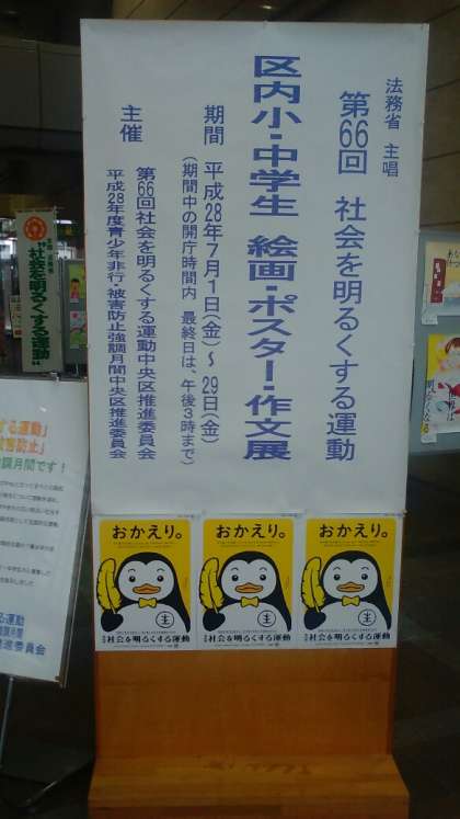 昨日、会議で中央区役所に行った時に、1階ロビーに区内3中学校のポスターや作文が掲示されているのに気づきました。これは「社会を明るくする運動」の一環の区内小中学生による絵画・ポスター・作文コンクールの入選作品でした。
