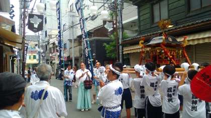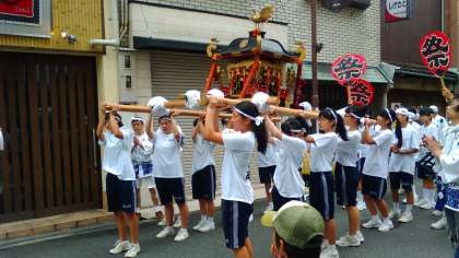 ご祝儀をいただいたお家の前では、一軒一軒大阪締めを行い、それに合わせて神輿を高く上げたり、揺らしたりします。なかなか力のいる作業ですが、女子も男子も頑張っていました。