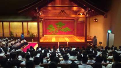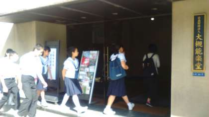 今日の5・6限目を使って芸術鑑賞を行いました。今年度は伝統芸能の鑑賞ということで、全校生徒で大槻能楽堂へ行き、狂言を鑑賞しました。