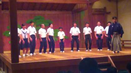 最初に生徒代表10名の体験が行われ、狂言の姿勢、感情表現を教えていただきました。能舞台に上がることなど普通はできないので貴重な体験になったと思います。