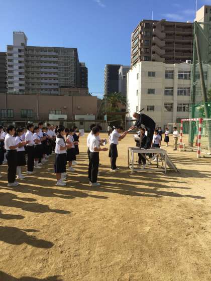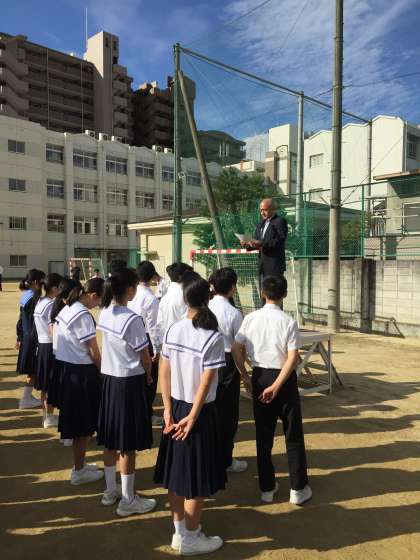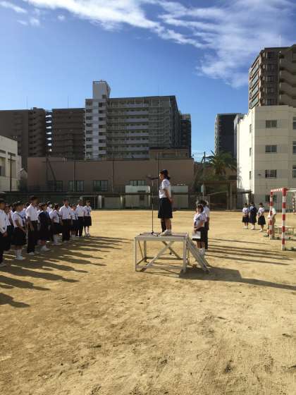 今朝、素晴らしい秋晴れの中、久しぶりに運動場で生徒集会・後期役員認証式が行われました。