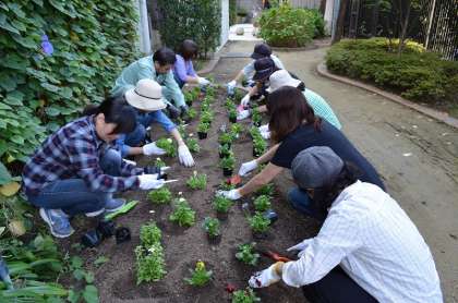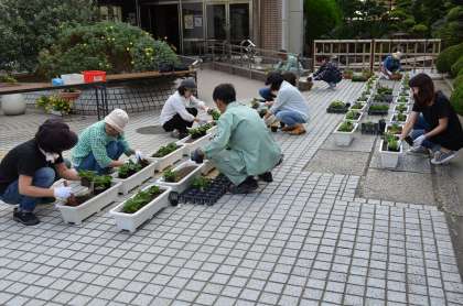 10月19日(水)PTAの緑化委員さんによるプランターなどの苗の植え付けが行われました。管理作業員さん(大宗さん、小西さん)の説明のあとみんなで植え付け作業をおこない、正門付近から校舎まわりにかけて、きれいに並べて植えつけてくださいました。