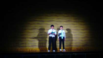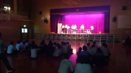 大道具、小道具、衣装も揃え、全員が体育館に集まって行いました。照明・効果音・パワーポイントのタイミング、役者の身体の向き、道具の出し入れ等、細かい部分を確認しながら進めていました。