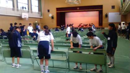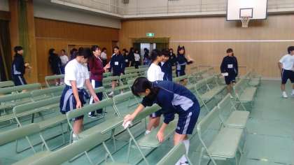 文活前日準備として、1・2年は校舎等の清掃、3年生は清掃も含めた体育館の準備をしてくれました。長椅子を丁寧に縦横揃え、きれいに拭いてくれました。舞台のうえも掃いてきれいにしてくれました。