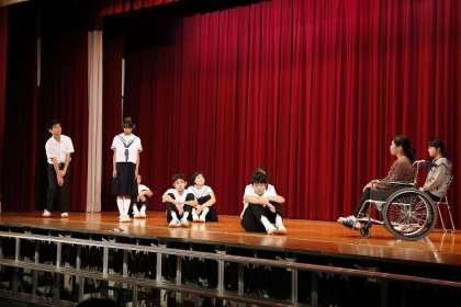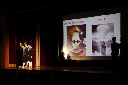 2年生は、そばにいるのに本当に理解することの難しさ、他者理解を自分たちのこれまでの取組を振り返った等身大の劇にして見せてくれました。圧巻の演技力で、暗転の時にどよめきが起こるほど魂のこもった迫真の演技でした。最後に自らが行った「平和学習」調べレポートも行い、非常に中身の濃い発表になりました。