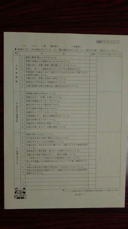 教職員の授業力を向上させるために、先日の土曜参観より教員による「相互授業参観」が始まりました。お互いの授業を見合って、アドバイスシートを使って気の付いたことを出し合い、学年会、あるいは教科会で話し合い、それぞれの授業力を向上させていこうというものです。