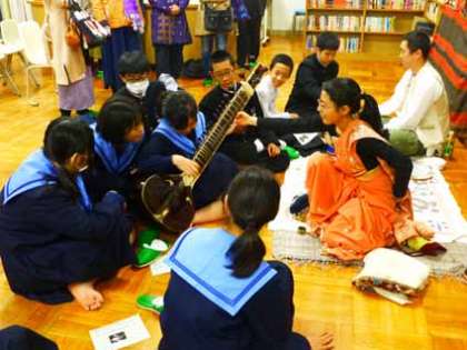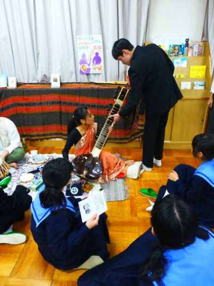今回使われたタブラという楽器は北インドの太鼓の一種で、高音用と低音用の二種類の楽器を組み合わせて指を駆使しながら複雑で多彩な表現を演出します。演奏するのがとても難しいと言われる打楽器の一つです。シタールも北インド発祥の楽器で、ギターの原型と言われる楽器です。伝統的なものは19弦、棹は長さが約90cmありますが、中身が空洞なので持つと以外に軽く感じられました。照明を落とした図書室で、民族衣装に身を包んだお二人の息の合った合奏が始まると、生徒たちをはじめとする観客全員がたちまちその神秘な世界に引き込まれ、演奏者の巧みな手の動きに目が釘付けになりました。
