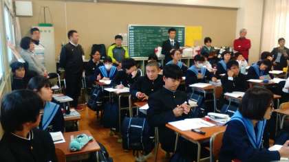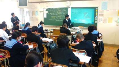 今日の2時間目、1年数学の井上先生が研究授業を行いました。本校のたくさんの先生方が参観に来られ、井上先生の授業を見守りました。教育センターからも吉岡指導主事にお越しいただき、授業を観ていただきました。
