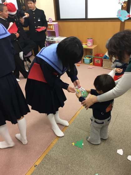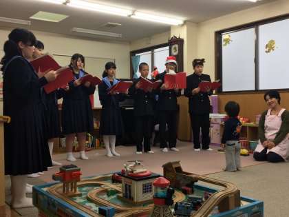 今日の放課後、合唱部は「田中キッズクラブ」へ出向き、就学前の子どもたちの前でクリスマスミニコンサートを行いました。先日の「ふれあいセンター もも」で披露した全曲の後、アンコールの声に応えて、星野源さんの「SUN」をアカペラで歌い切りました。