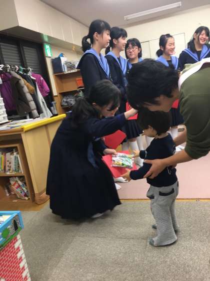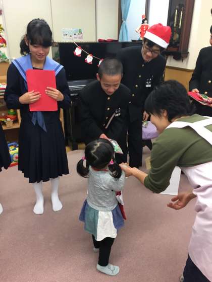 発表後は子どもたちとふれあい、最後にクリスマスカード(?)を一人ひとりにプレゼントしてミニコンサートを終えました。
