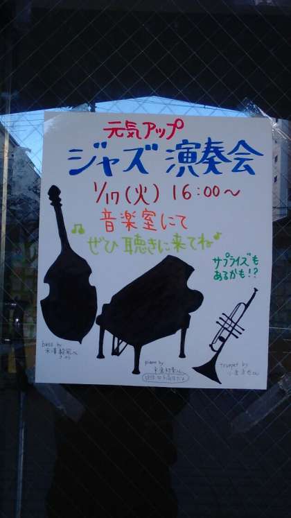 明日17日(火)午後4時から本校4階音楽室で元気アップ事業主催の「ジャズ演奏会」が行われます。