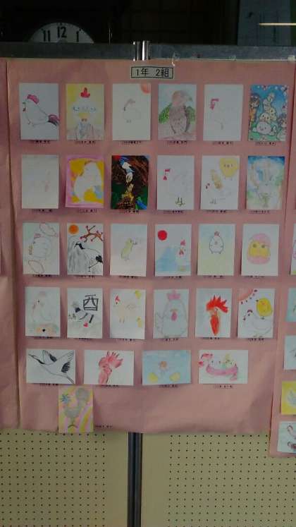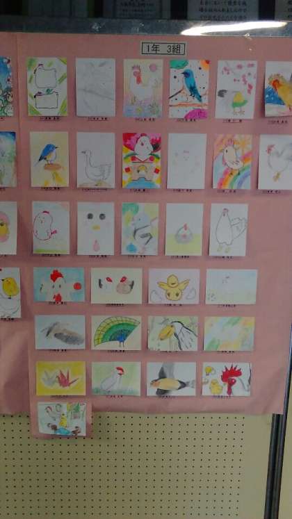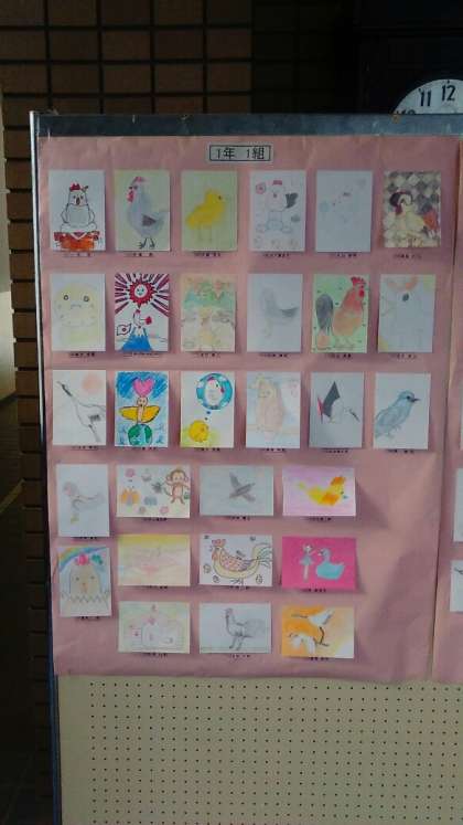 美術の冬休みの課題である酉年にちなんだ「鳥のイラスト」が玄関ホールに貼りだされています。全学年への課題で、学年として観ても、個人個人を思い浮かべながら観ても、それぞれの個性が出ていて思わずニンマリしてしまいます。