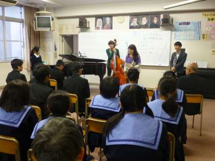生徒たちからは「どうしたらそんなに指を早く動かして鍵盤を叩けるのか」「トランペットの先につけてあるものは何ですか」などと質問も次々あがり、関心の高さがうかがえました。