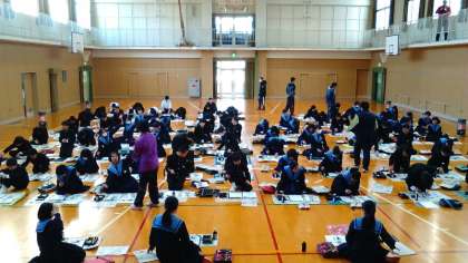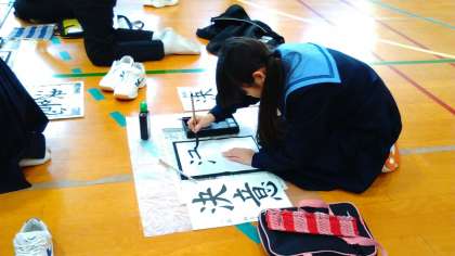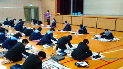 本日の5限目、1年生は「新春席書会」を行いました。学年全員が体育館に会し、習字道具を広げ、限られた枚数の半紙を前に、書くことだけに集中するという取組です。