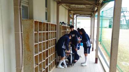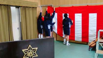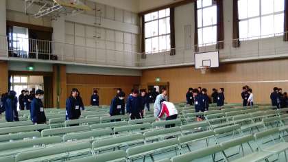 午前中の卒業式予行練習の後、2年生全員と1年生係生徒が残って式場準備をしてくれました。体育館回りを中心とした校内の清掃や体育館内のシート敷きから椅子並べ、紅白の幕張りなど、一生懸命やってくれました。