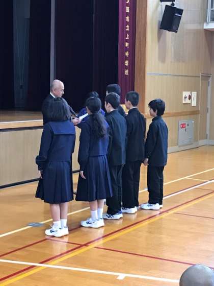 今年度の最終日、修了式の前に来年度前期の生徒会役員の認証式が行われました。その後、今年度後期の役目を終えた前会長から退任の挨拶、新会長から着任の挨拶がありました。任務を終えた役員の皆さん、お疲れ様でした。