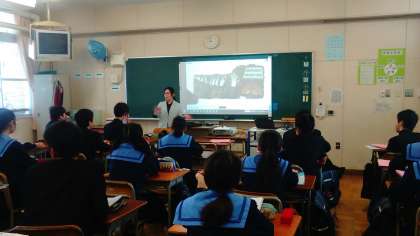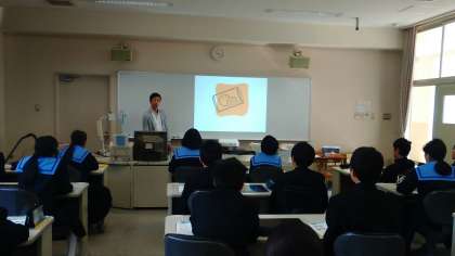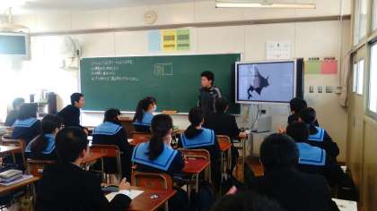 今年度、上町中に来られた先生方の授業の様子です。1年生の英語は、LL教室で小学校の時に習った色や数字、教科名や曜日・月名などの復習をプロジェクターを使って行いました。