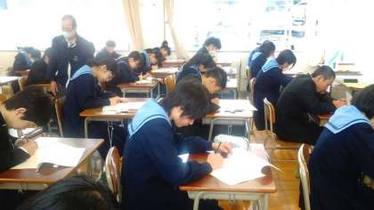 今日は、全国の中学3年生が学力・学習状況調査に取り組みます。始まる前に、解答用紙への名前記入や注意事項の確認を行っています。自分たちの進路に関わる大切なテストなので、全員が最後まで粘り強く取り組んでほしいと思います。頑張れ、上中3年生!