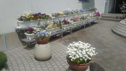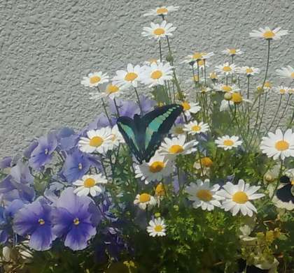 これらの花たちに誘われて、アオスジアゲハチョウが花から花に渡って蜜を一生懸命吸っていました。こんな素敵な環境をつくるために、日々、管理作業員さんたちが手入れをしてくれています。また、園芸部や生徒会、PTA緑化委員会のみなさんも節目節目で花の手入れを手伝っていただいています。そのお気持ちを大切にし、花をめでて、季節を感じていきたいものですね!