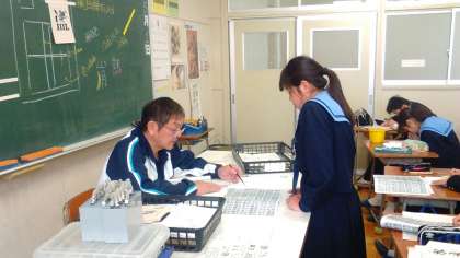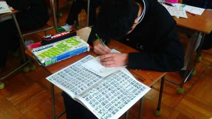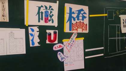 2年の美術では、漢字と絵を融合させた「絵文字(?)」に取り組んでいます。その漢字の意味や部首の形などから、漢字の一部分を絵にして、面白いデザインにします。まずはレタリングの教科書から書きたい漢字を探します。