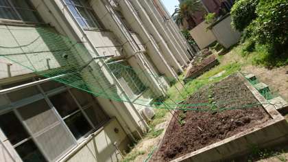 ゴーヤ畑に校舎2Fよりネットを張りました。
