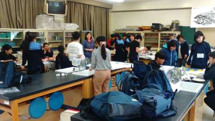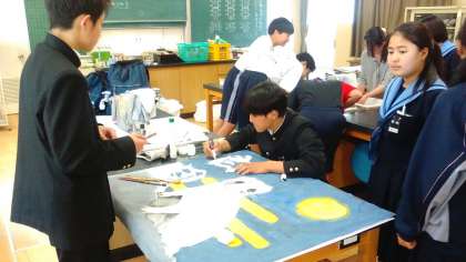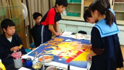 2年生が作成してくれている体育大会の団旗がいよいよ完成に近づいてきました。どの団も色塗りを行っており、完成した団もあります。