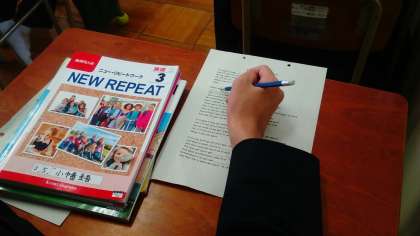 今年度も毎週金曜日には、ネイティブスピーカーのキース先生にお越しいただいています。今日は3年の英語の授業で、英語の歌を聴いて歌詞カードのブランクを埋めるという、英語を聴き取り、書く学習をしていました。
