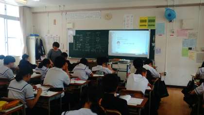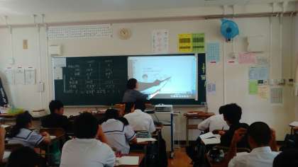 2年の数学でデジタル教科書を使った授業をしていました。前に映し出された画面に直接書き込むことができるので、説明しやすく、子どもたちにとっても分かりやすいのではないかと思います。今日は、「式の値」についての授業でした。