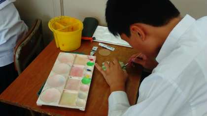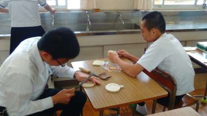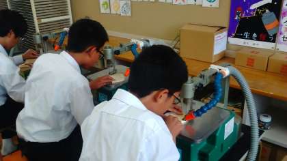 3年生の美術では、木製のコースターを製作しています。糸ノコギリで形を切って、ヤスリで表面を整え、色付けをします。みんなの個性が出ている作品になりそうです。