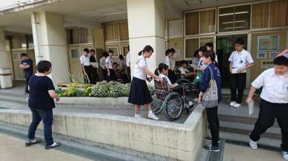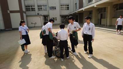 説明の後、校内を班に分かれて車いすで移動し、使用方法などを体験しました。