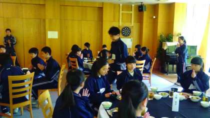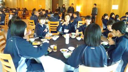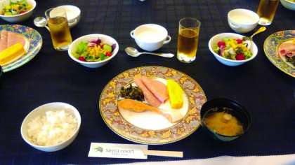 本日の朝食です。男子は結構おかわりをしていました。お茶のように見えるのは、実はアップルジュースです。さすが長野県ですね。
