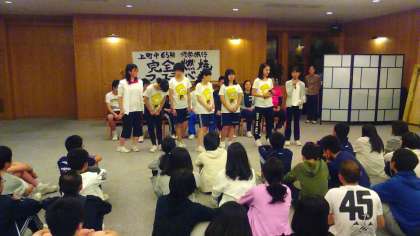 修学旅行最後の夜は、有志の司会によるオープニングショー、クラスのスタンツ、合唱部、有志、そして飛び入りの先生方による大喜利と盛りだくさんのレク大会となりました。