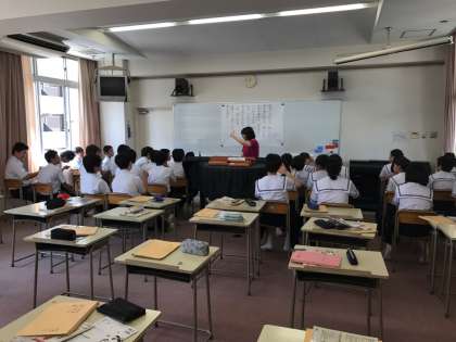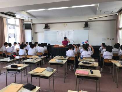 2年の音楽では、ユニークな発声練習をしていました。自分の手の高さで音階をイメージし、発声するというものでみんな手を前に出して声を出していました。また、大江先生の声がピアノの弦に共鳴し、音が出るというすごい技(?)も見せていただきました。