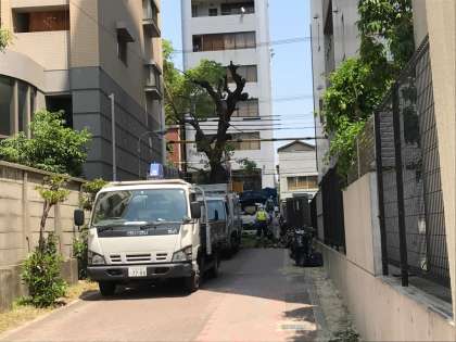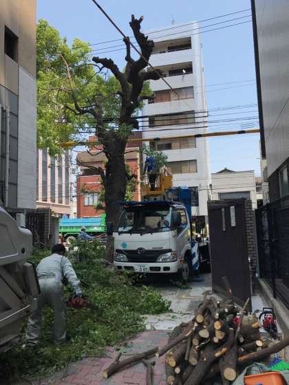 本校の東門の外側にある楠(クスノキ)の枝を、伐採してもらいました。落ち葉の季節は、毎日掃除が大変でしたが、教育委員会の管轄ということで、教育委員会が業者の方を派遣してくれました。しばらくは、すっきりした状態で落ち葉掃除の心配もないと思います。ありがとうございました。