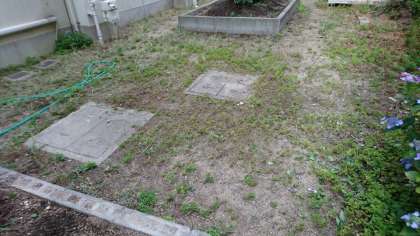 下の写真は、抜いた雑草の山と、久々に地面の見えるようになり、すっきりした裏庭です。