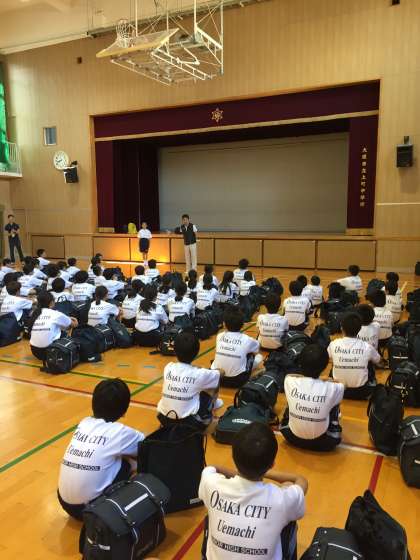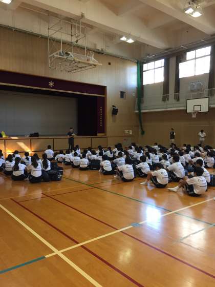 1年生は今日から一泊移住に出発しました。目的地は、京都府立青少年海洋センター マリーンピアです。出発式は委員長会が司会進行し、生徒代表のあいさつ、今回同行する教頭先生のごあいさつ、そして吉川先生からの諸注意が行われました。