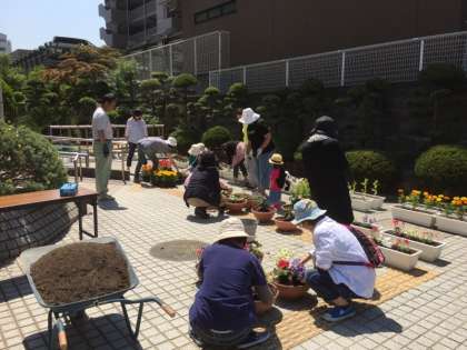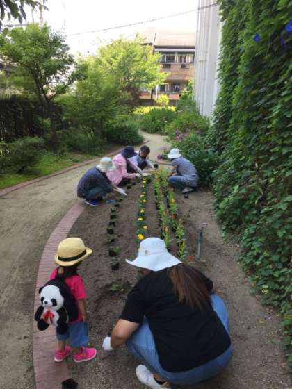かわいい緑化委員さんも参加してくれて、総勢13名の方が集まってくださいました。本校の自慢の一つの、校内にあふれる花は、こんな協力や地道な努力によって支えられていることを改めて感じました。また、今日に至るまでの準備をしてくださった管理作業員さんのご支援にも心よりお礼を言いたいです。
