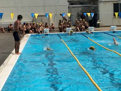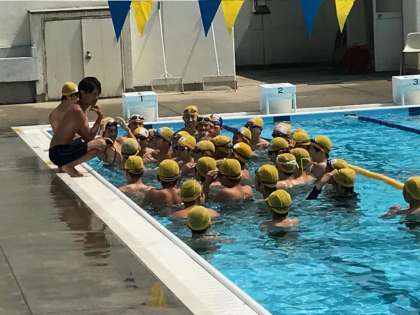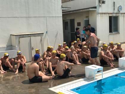 教育実習も最終週に入り、研究授業が相次いで行われています。今日の2時間目は、体育の研究授業が行われました。プールの授業で暑い中でしたが、大学からも指導教官の先生が参観にお見えになり、授業後アドバイスをしておられました。また、本校の先生方、教育実習仲間も参観に来られてました。