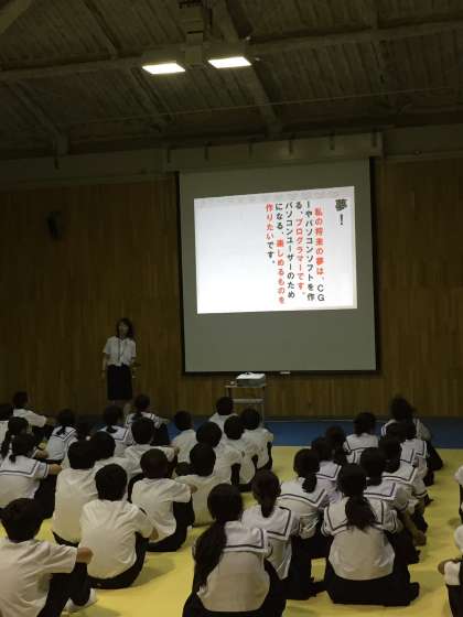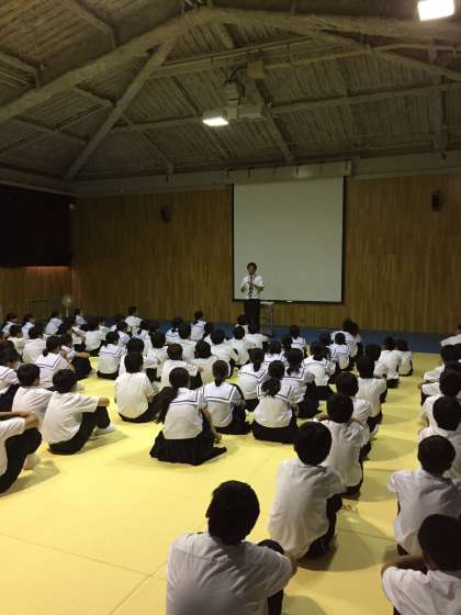 桃田先生からは自分の目標に対して「今を全力で生きる」大切さをパワーポイントを使って自分の小学校卒業文集から海外での経験までのお話がありました。