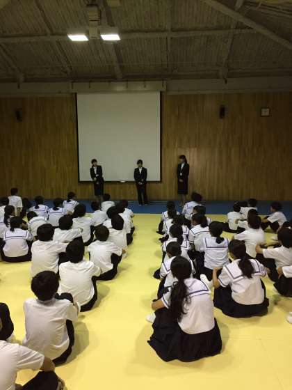 本日5限目に、1年生の学級で実習をしている教育実習生から話をしてもらいました。