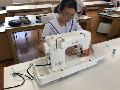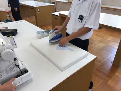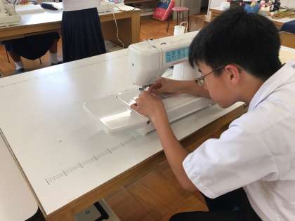 1年の家庭科は、ランチマットの製作をしています。今日はお箸を入れる三角ポケットの部分を作っていました。きれいに折って、アイロンをあててからミシンで縫うという作業ですが、普段使っていない人は悪戦苦闘していました。お家でも家庭科の授業を活かしてほしいものですね。