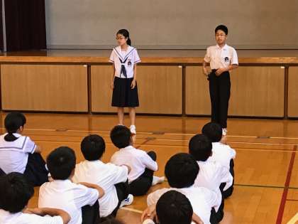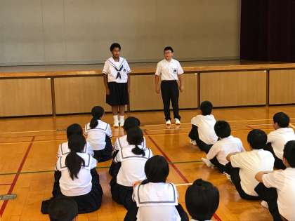 1年生は学年集会の中で、各クラスの委員長から1学期を振り返ってクラスの課題と良かったところを順に発表していきました。2学期はそれぞれの課題が克服できるように、クラス全員で課題と向き合って改善していってほしいと思います。
