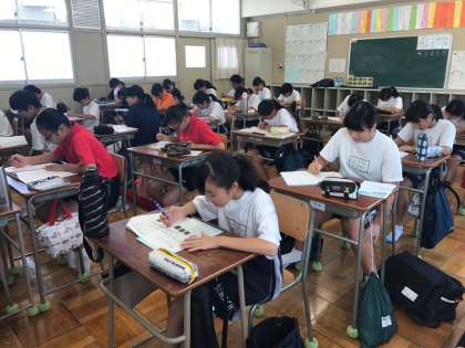 バドミントン部の今日の練習は午後から体育館なので、午前中に教室を借りて学習会を行っていました。もう少しで夏休みも折り返し地点になります。まずは宿題を完成させ、苦手教科の克服や自由研究に取り組むようにしましょう。特に3年生は受験に向けての計画的な3年間の復習に取り組みましょう!
