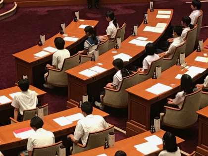 本日、大阪市役所市会本会議場で子ども市会の本会議が行われました。大阪市内から86名の中学生が集まり、吉村市長に様々な質疑を行いました。本校からは、生徒会の3名が参加しました。