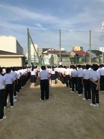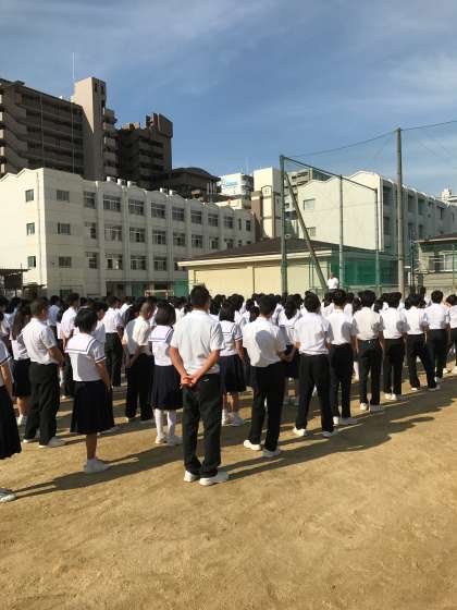 さわやかな晴天の下、生徒集会が持たれました。校長先生からは、先週から話題になっているルール違反、またこの間続いた各学年のトラブルを受け、常に校長先生がおっしゃっておられる「相手の立場に立って考え、行動しよう!」「相手の気持ちをおもんばかろう!」ということを、上中生として再度、肝に銘じてマイナスの部分をリセットしてほしい、というお話がありました。