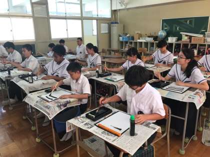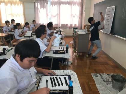 書道も小学校の時以来という人が多く、筆先がカチカチに固まっている人もいましたが、先生の指示に従って、「止め」や「はね」等の基本的な筆遣いを練習していました。時には手紙や年賀状を筆で書くぐらいになってほしいですね!