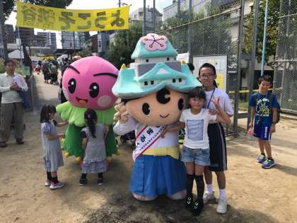 今年は中間テストの4日前ということもあり、中学生のお手伝いは少なくなってしまいましたが、それでも生徒会のメンバーが4名参加してくれ、上中ではふれ愛まつりでの恒例になっている「ゆめまるくん」「ももっぴー」に変身してくれて、暑い中を小さなお子さんやお年寄りとの写真撮影に応えていました。4名の皆さん、忙しい中、本当にありがとう!