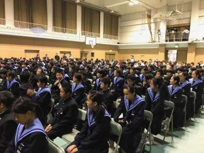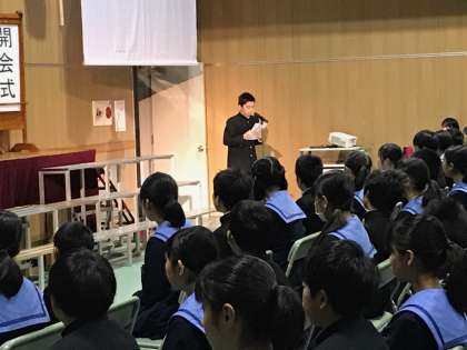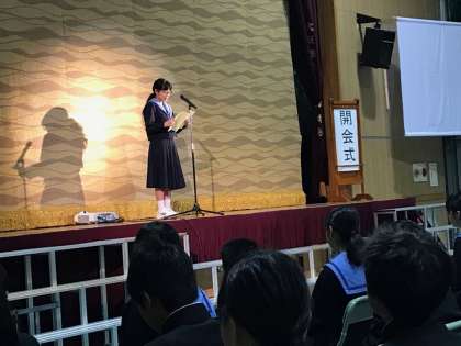 文活の開会式です。校長先生のごあいさつの後、生徒会長が挨拶をし、舞台進行や鑑賞に関する諸注意が副会長からありました。早朝より保護者・地域の皆様もたくさんおみえになっています。