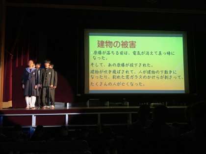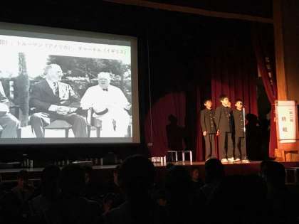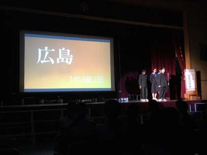 トップバッターは1年生の研究発表と合唱です。平和を大きなテーマとして、各クラスの班ごとにタブレットを駆使して調べ学習をし、パワーポイントでまとめました。